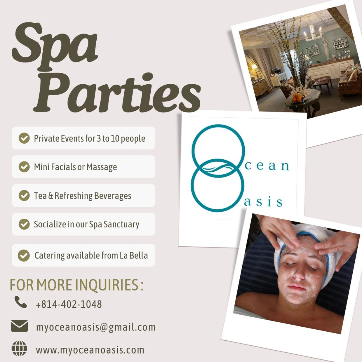 We would love to host your special event, birthday party, wedding or baby shower in our luxerious spa sanctuary. The Ocean Oasis will serve organic teas and champagne by request. Catering available from La Bella. Our relaxing music, aromatherapy, and mini spoa treatments will provide the perfect enhancement for your special occasion. Spa Events can be booked in the evening from 6pm to 10pm or anytime Sunday through Wednesday afternoon.